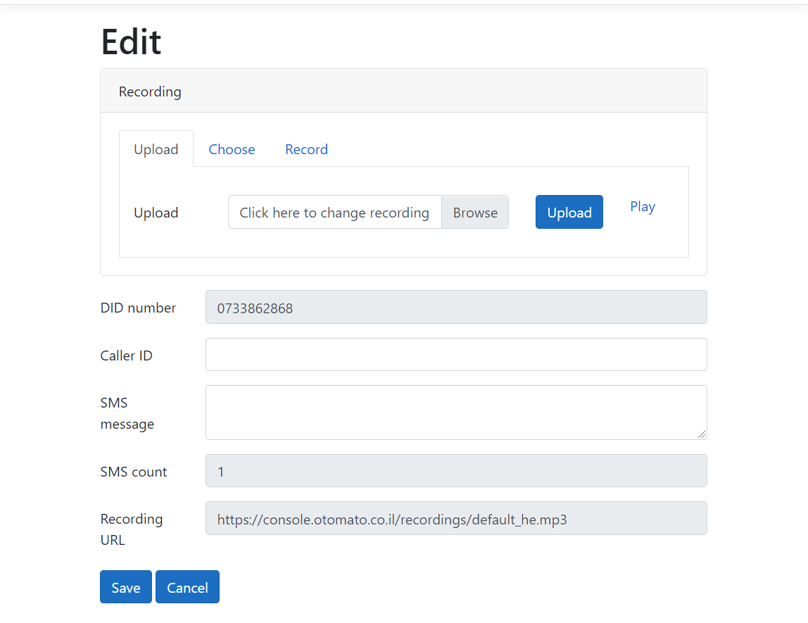 לאחר בחירת ההקלטה ניתן לבצע שינויים בגוף (תוכן) ההודעה ובמזהה השולח באמצעות השדות SMS Message וCaller ID בהתאמה.